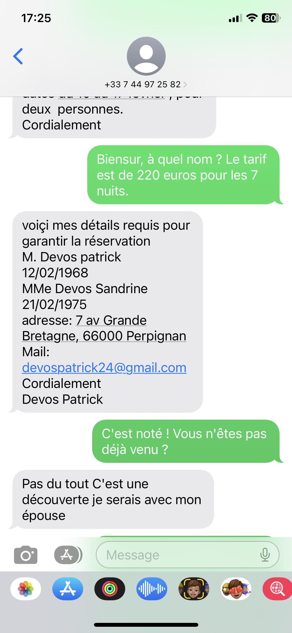 Dans la demande de réservation la personne indique les dates de naissance pour sécuriser la réservation. Je ne me suis pas méfiée, je lui ai dis de payer à son arrivée mais biensûr personne n’est venu et en cherchant sur internet, j’ai vu d’autres arnaques avec le même nom et numéro de téléphone. Si vous lui demandez de payer avant, il vous enverra un lien pour récupérer son paiement paylib ou autre et l’arnaque est là, il va probablement récupérer vos coordonnées bancaires.